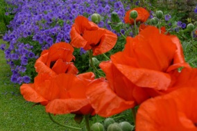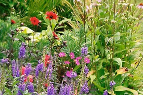 A cottage garden with an abundance of flowers and colour.
