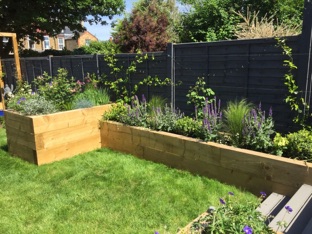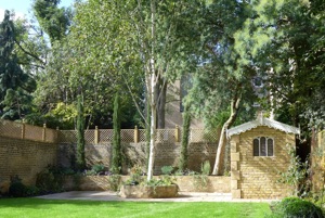 Unsightly old trees were removed bringing instant light. New fencing, raised beds and terrace were built at rear of the garden.