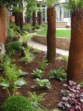 I used shade loving tree ferns with box balls, alongside Hostas grasses and fern for textured planting on the shady side of the garden.