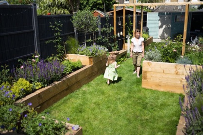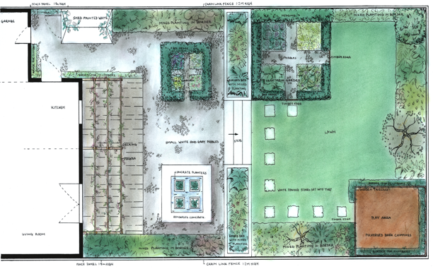 The first had different levels of raised borders. A raised planter was built across the garden to create a room and give the illusion of width.