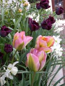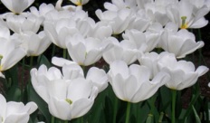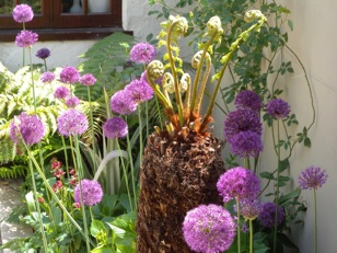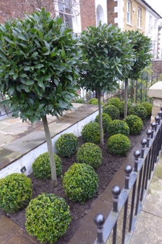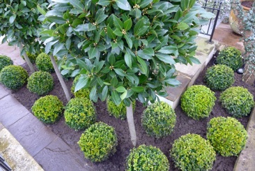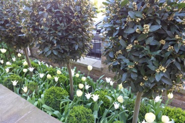 I planted mature standard bay trees with box balls planted irregularly around their base. Bulbs were planted on mass of white tulips followed by purple Allium .