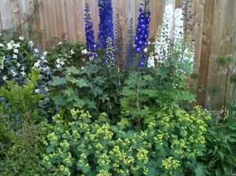 Waves of colour run through the garden each season. Purple alliums in May, pale blue irises in June blending in to dark blue agapanthus and pink astrantias throughout the summer.